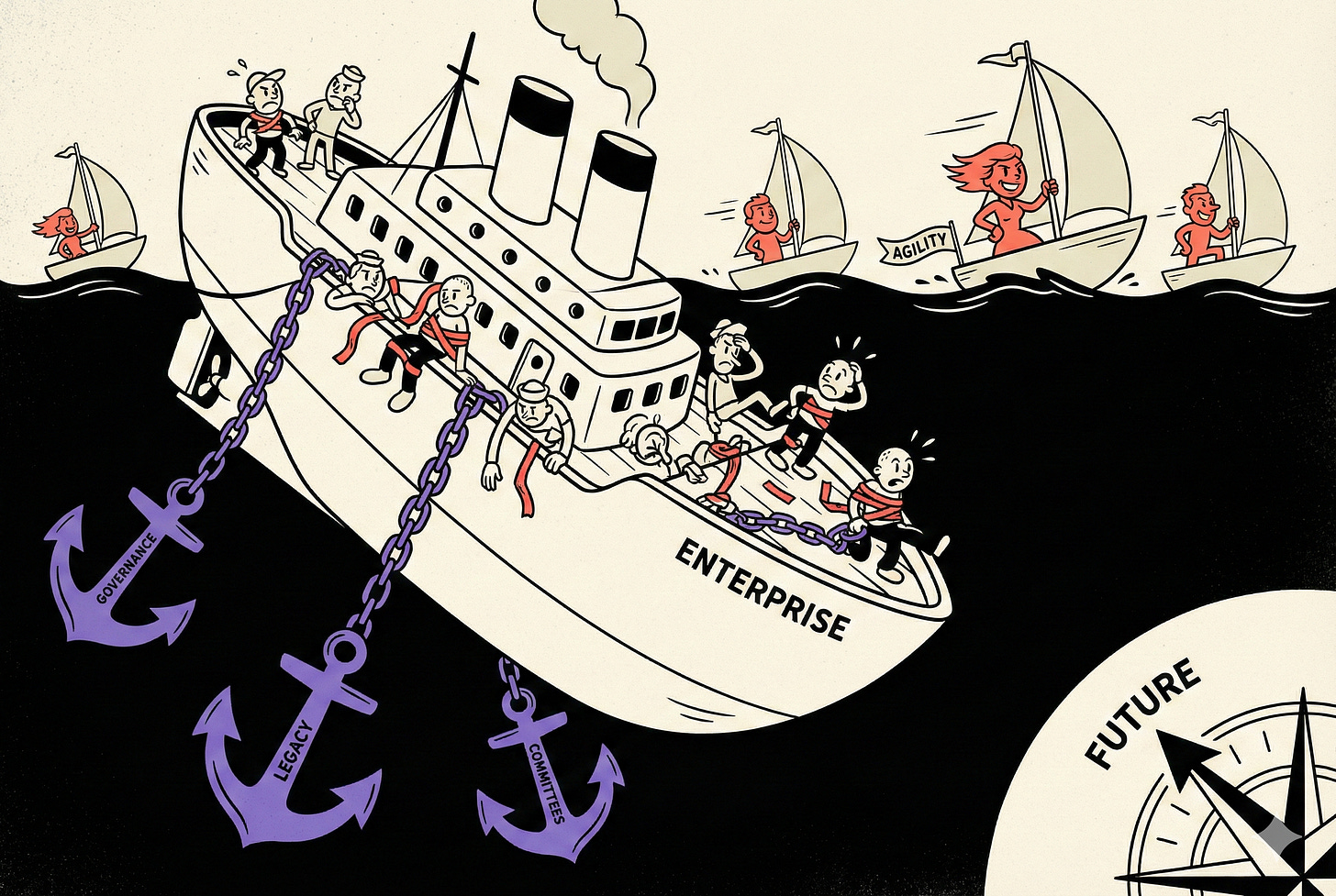 Here’s what nobody’s saying: the barrier isn’t technology. It’s organizational weight. The same resources that helped large companies win for decades (big IT teams, governance frameworks, structured processes) are now anchoring them to the ocean floor while smaller companies sail past.